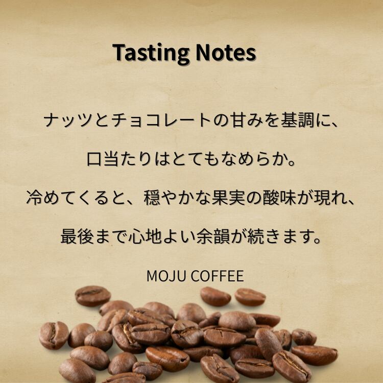 熟練生産者による手摘み完熟チェリーを使用。チョコレートのような甘みと豊かな香り、滑らかな飲み心地が特徴です。冷めるほどにコクが増し、クリアな余韻が続く一杯。