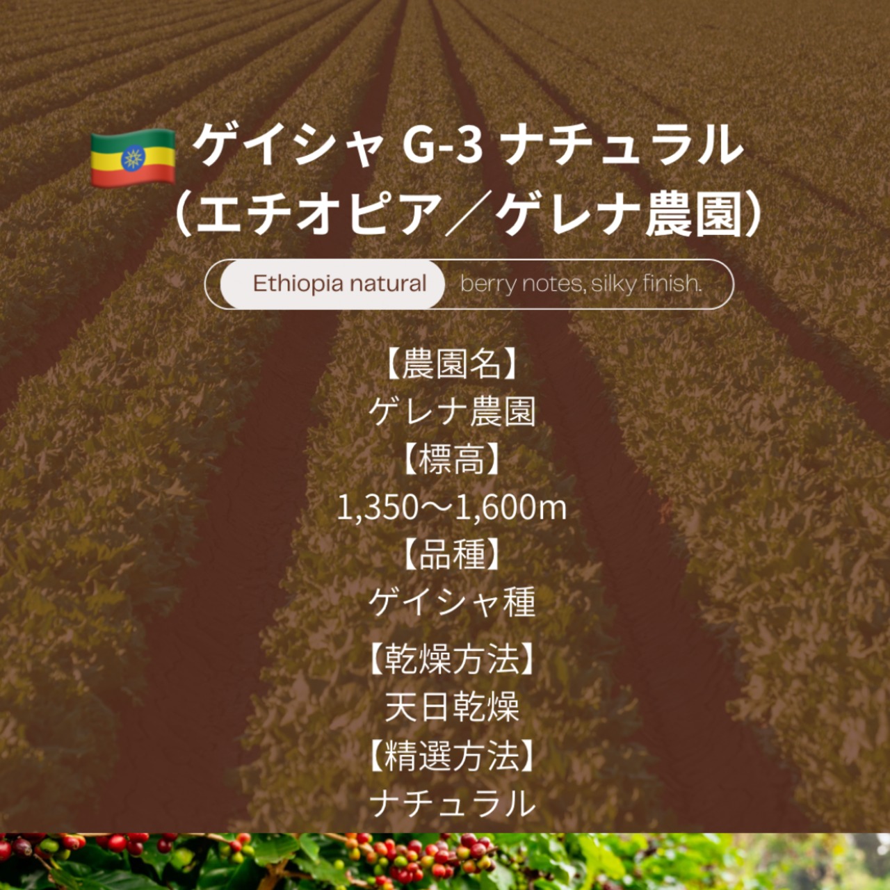 エチオピア南部・グジ地区ゲレナ農園で栽培された、希少なゲイシャ種。